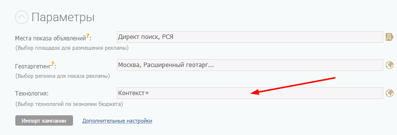 Технологию можно подключить для любого проекта в модуле контекстной рекламы PromoPult. При заведении нового проекта или корректировке существующего выберите Контекст+ на шаге «Параметры» настроек контекстной рекламной кампании.